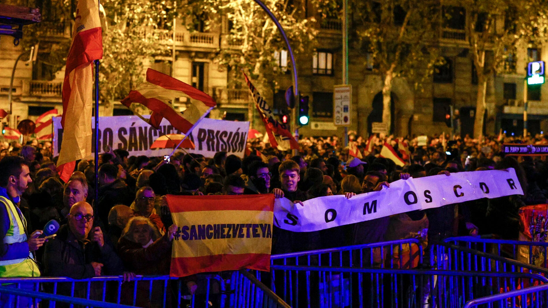 Unas 1.500 personas participan este miércoles, según datos de la Delegación del Gobierno, en la concentración convocada ante la sede central del PSOE en Madrid en protesta contra la ley de amnistía, en la que hasta las 21:30 horas no se habían producido incidentes.