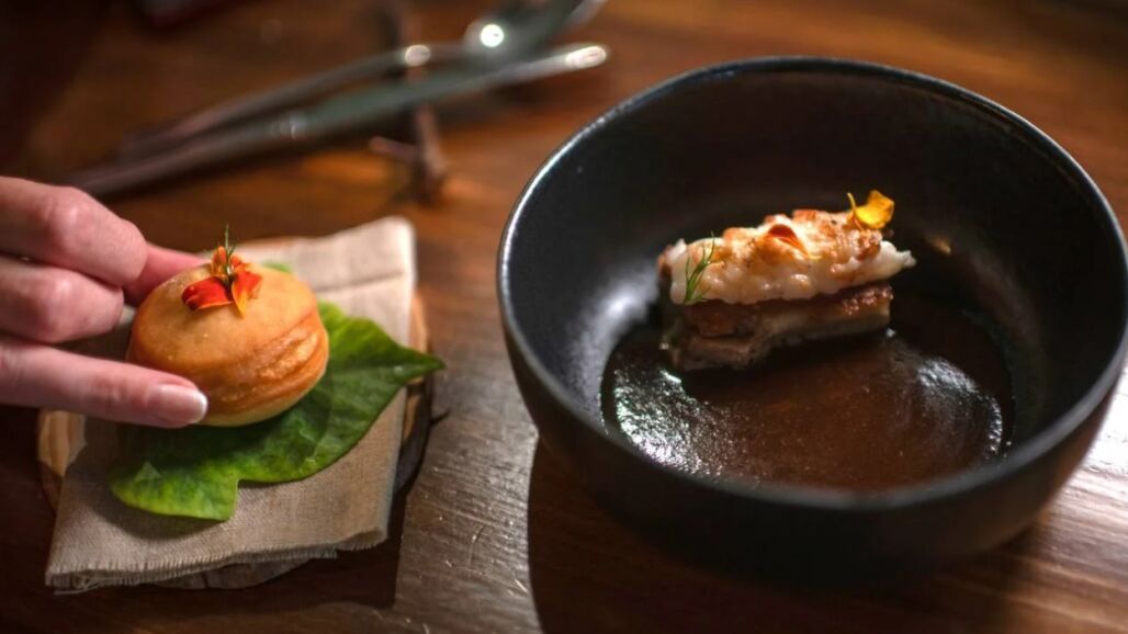 En los platos de LUR hay mar y hay montaña, pero en todos hay mucha técnica, mucha cocina y mucha salsa. Eso queda demostrado en platos como el guiso de rabo de cerdo ibérico, cigala al carbón, regaliz y lima con un fondo excelente, con sabor y color intenso, que no quita protagonismo a la cigala del mediterráneo. Aparte, acompaña una berlina rellena con una salsa del jugo de la cigala. "Este plato lleva muchas horas, pero esto es cocina para quien nos gusta cocinar", comenta Lucía Gutiérrez, que es la encargada de presentar los platos en la íntima sala de LUR.