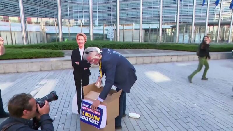 O'Leary se disponía a hacer unas declaraciones a la prensa delante de la sede de la Comisión Europea (CE), cuando dos activistas le arrojaron a la cara una tarta mientras le decían "bienvenido a Bélgica".