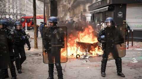 La puesta en escena reflejó el profundo malestar contra Macron, plasmada en los carteles y cánticos contra él, algunos rescatados de la época de "los chalecos amarillos", la revuelta popular que desde finales de 2018 puso en apuros al presidente.