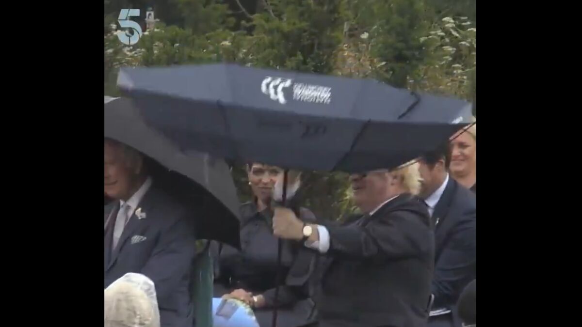 El suceso tuvo lugar en el condado de Staffordshire, mientras se celebraba una ceremonia oficial del Memorial en honor a los policías caídos en servicio. Johnson acudió, entre otros invitados, y comenzó a llover, por lo que tuvo que sacar un paraguas para resguardarse del agua. Sin embargo, el fuerte viento le dio la vuelta a la tela, un fenómeno muy habitual en estos casos.
