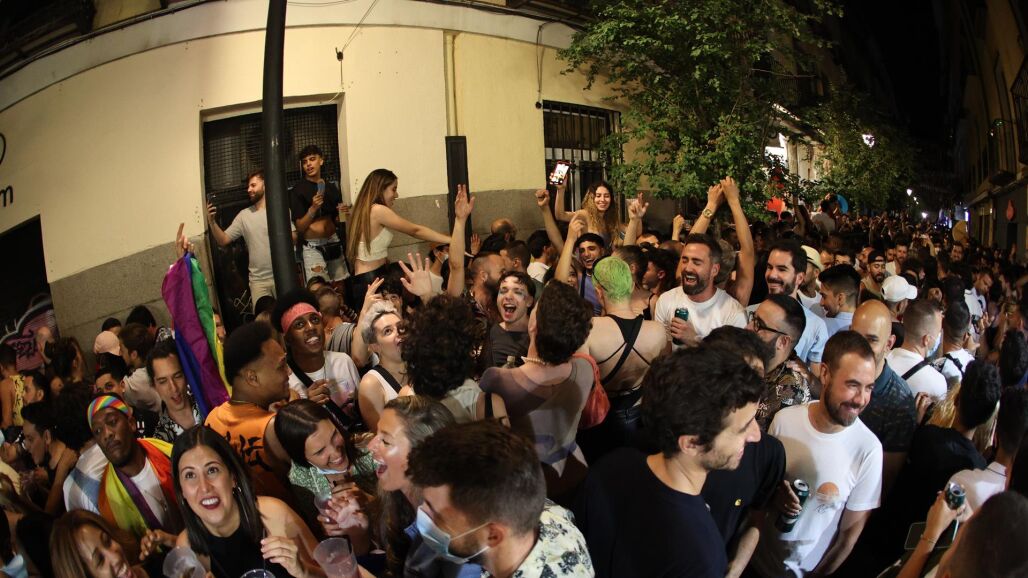 La céntrica plaza de Chueca, en Madrid, ha vuelto a ser escenario de aglomeraciones una noche más en el marco de la celebración del Orgullo LGTB pese a la presencia policial en la zona.