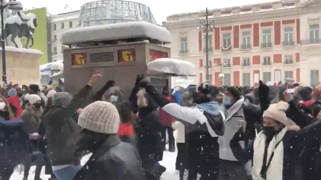 Por eso, las imágenes que se han contemplado esta tarde en la Puerta del Sol son cuanto menos llamativas. Decenas de personas han improvisado una 'rave' y al ritmo del tema de Alaska 'A quién le importa' se han puesto a cantar y bailar, e incluso a tirarse bolas de nieve, sin respetar la distancia de seguridad.