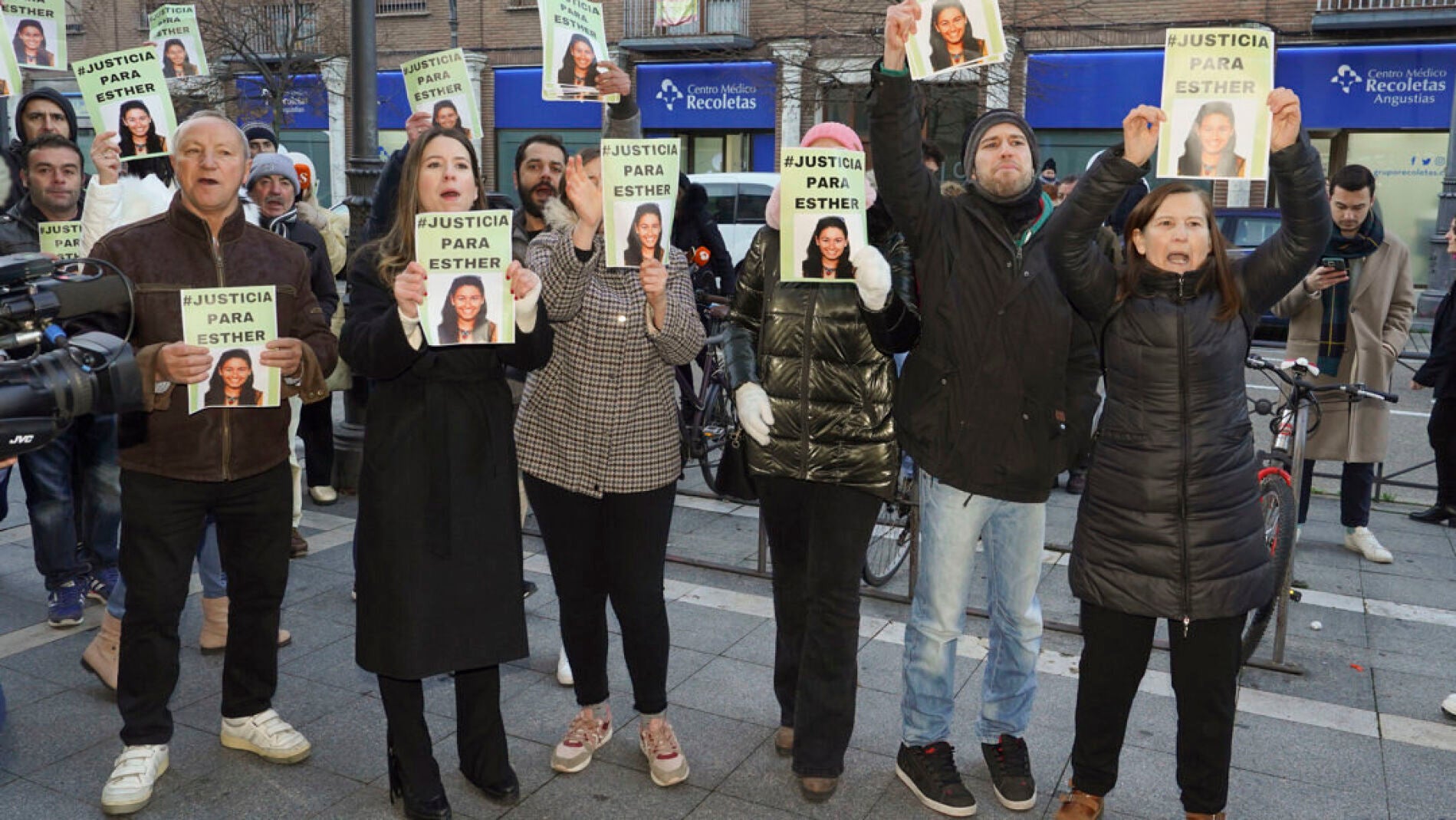 Varias personas se encontraban concentradas en el acceso lateral de los juzgados y cuando se han enterado de que el investigado ya había llegado se han dirigido a la puerta principal, custodiada por la Policía Nacional, y han comenzado a corear "Justicia para Esther", con carteles con la imagen de la víctima.