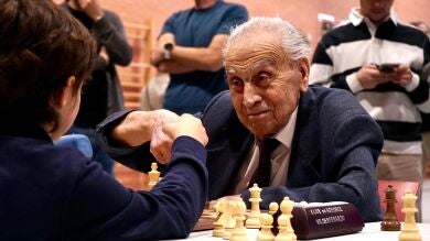 "Creo que soy el más viejo que todavía juega al ajedrez. Es mi cumpleaños hoy, 104 años", me dice con una sonrisa mientras acomoda las piezas en el tablero del Club de Ajedrez Valdebernardo, en Madrid, donde los compañeros le han preparado un torneo homenaje. "Pensé que llegaría como mucho a los 80, pero me he pasado de las raya", añade entre risas.