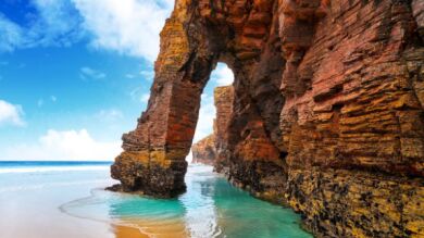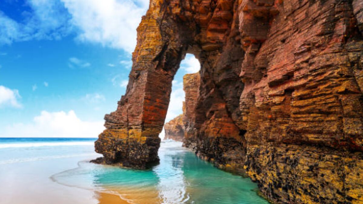 La Playa de las Catedrales, conocida también como Playa de Aguas Santas, es uno de los destinos más icónicos de Galicia y una de las playas más impresionantes de toda España. Situada cerca de Ribadeo, en la costa de Lugo, destaca por sus formaciones rocosas esculpidas por la erosión del viento y el mar, creando arcos y cuevas naturales que se asemejan a los arbotantes de una catedral gótica, de ahí su nombre.