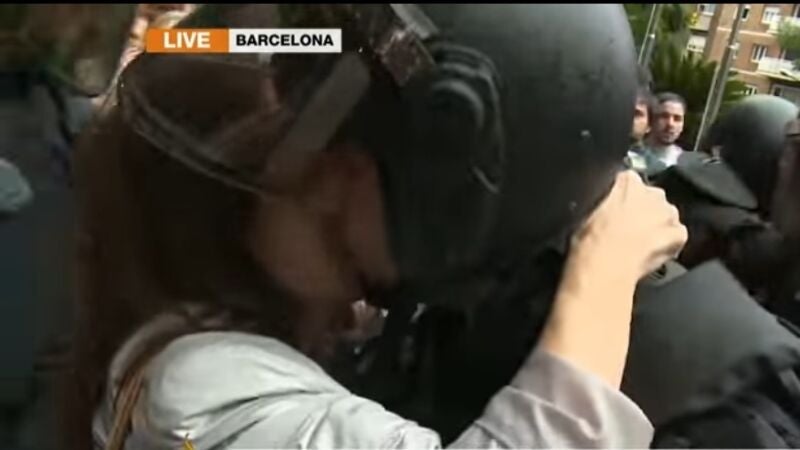 Los hechos ocurrieron en la calle Vía Augusta frente a los Servicios Centrales del Departamento de Enseñanza, usado como colegio electoral, como se puede observar en un vídeo que se adjunta en la demanda que pide identificar a la manifestante que, en un momento determinado, besa al policía, aprovechando que tenía levantada la visera de protección de su casco.