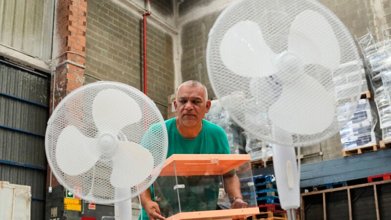 Un operario traslada urnas y ventiladores en los talleres municipales de Barcelona donde se está preparando el dispositivo para las próximas Elecciones Generales del 23J | EFE/Alejandro García