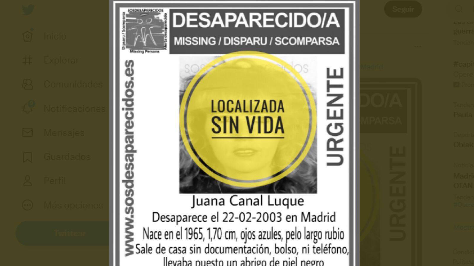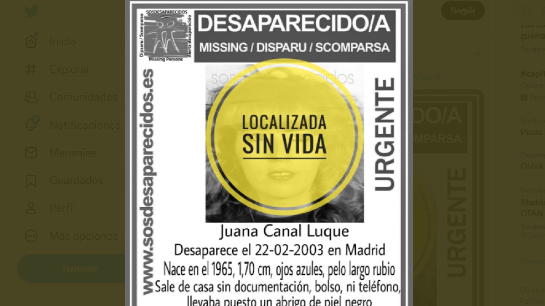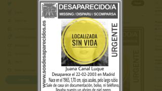 La Policía Nacional hallaba este martes, en la provincia de Ávila, el cuerpo sin vida de Juana Canal Luque, una madrileña que desapareció el 22 de febrero de 2003 sin que desde entonces se supiera nada de su paradero, ha informado la asociación SOS Desaparecidos.