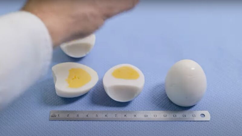 Está compuesto proteína de soja y parece un huevo duro real que se puede cortar por la mitad para revelar su distintiva "yema" de color amarillo envuelta por la "clara de huevo".
