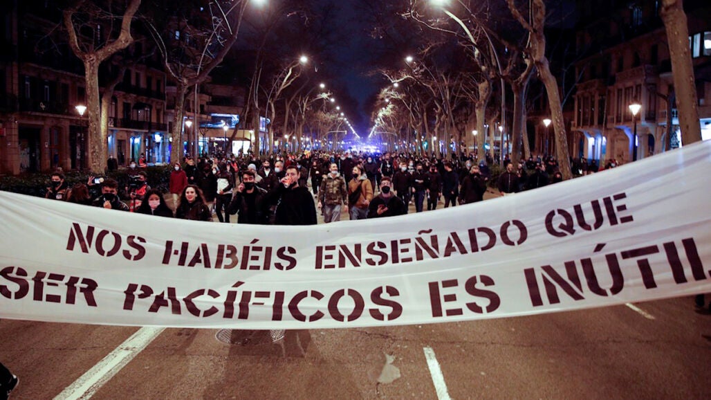 A la cabeza de esta manifestación se encontraba una pancarta en la que ponía: 'Jaque mate al régimen. Libertad Hasel' y ha terminado sin más incidentes que el lanzamiento de petardos contra furgones de los Mossos.