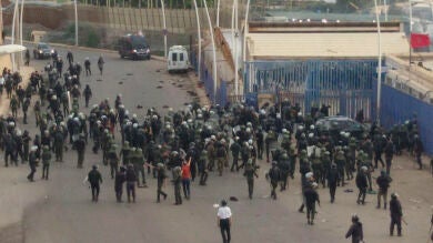 Con la finalidad de intentar entrar en territorio español, el grupo comenzó a ejercer la violencia contra las puertas de seguridad y otros elementos que separan los diferentes espacios de la zona de tránsito.