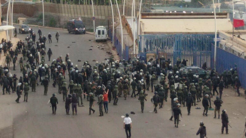 De forma simultánea, unas 100 personas escalaron el muro exterior del recinto fronterizo sobre el que está la valla marroquí, que finalmente se desplomó.