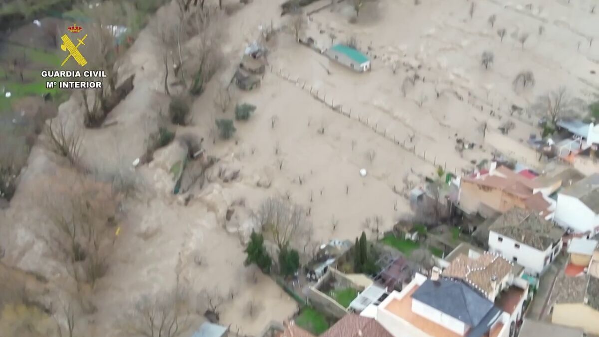 En un vídeo grabado por el dron de la Guardia Civil, cuyos agentes han coordinado la seguridad de la operación, se aprecia desde el aire la impresionante crecida del río, cómo las aguas han inundado terrenos, calles y carreteras y la comitiva de desalojo de los vecinos.