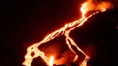 El volcán de La Palma ha sufrido este sábado, en su día 34 de erupción, un nuevo derrumbe parcial en su cono principal y ha seguido generando grandes derrames de lava que alimentan las coladas en su descenso valle abajo, donde sigue preocupando la suerte que correrá el barrio de La Laguna.