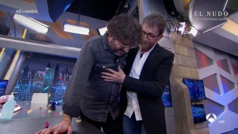 Esta declaración hizo que el periodista comenzara a reírse y sufriera un ataque de cataplexia. "Que le han dado 3.000 euros y parece que se le ha muerto un familiar", expresó mientras se levantaba de su silla, todavía entre risas. El periodista comenzó entonces a tambalearse y tuvo que apoyarse en la mesa. Por suerte, Pablo Motos corrió a socorrerle, agarrando al invitado y reaccionando muy preocupado, aún entre risas. "Es que somos gilipollas", le ha espetado el presentador del programa.