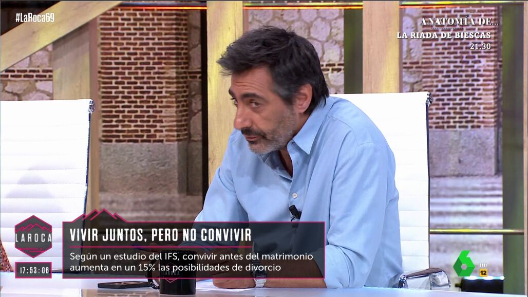 El programa 'La Roca', de LaSexta, planteó este fin de semana un debate sobre el éxito o el fracaso del matrimonio en nuestro país. El dato que exponía el programa era contundente e invitaba a la reflexión, ya que siete de cada diez parejas se separan. En este sentido, Juan del Val ha mostró su opinión sobre esta cuestión y se mostró contrario a la pareja como está concebida en general.