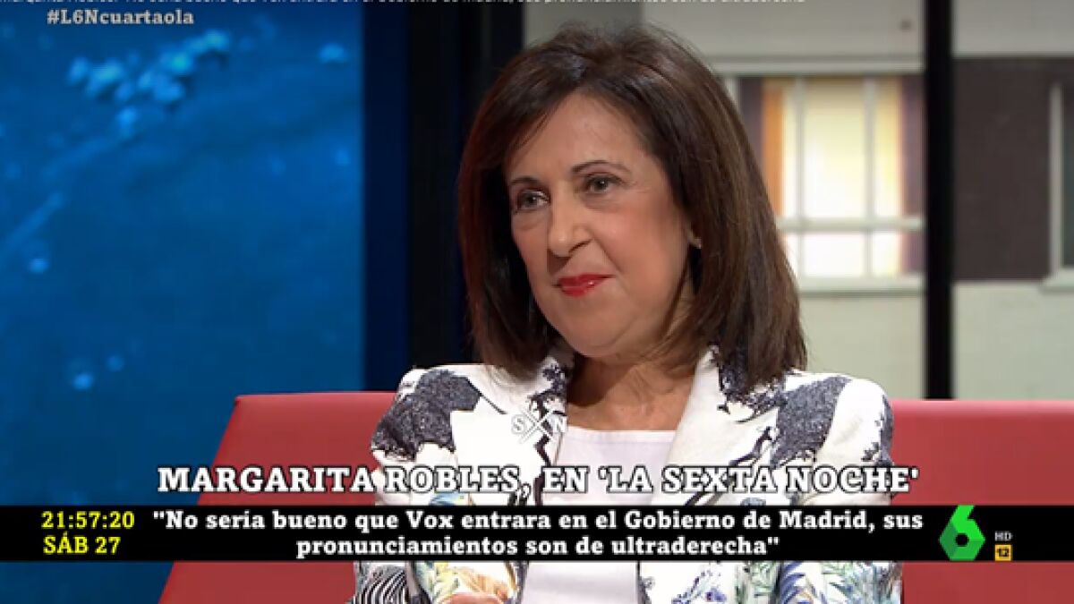La ministra de Defensa, Margarita Robles, ha criticado en el plató de laSexta Noche cualquier posicionamiento extremista. "España necesita en estos momentos unos posicionamientos totalmente al margen de los extremos, unos posicionamientos que no estén radicalizados", ha dicho.