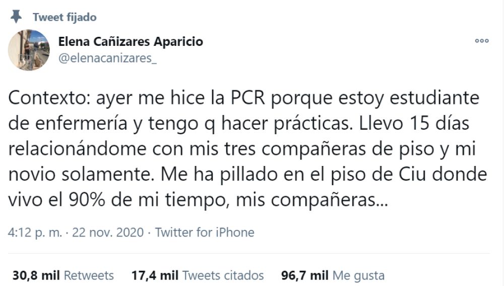 La historia de Elena Cañizares con sus compañeras de piso se ha hecho rápidamente en la redes sociales después de que estas intentasen echarla de la casa al haber dado positivo por COVID. La terrible conversación que mantuvo la joven estudiante de enfermería con sus compañeras de piso ha generado muchas críticas en las redes sociales, ya que estas mantuvieron una actitud muy dura con ella al pretender que abandonase la casa y se fuese a vivir con sus padres, que son personas de riesgo.
