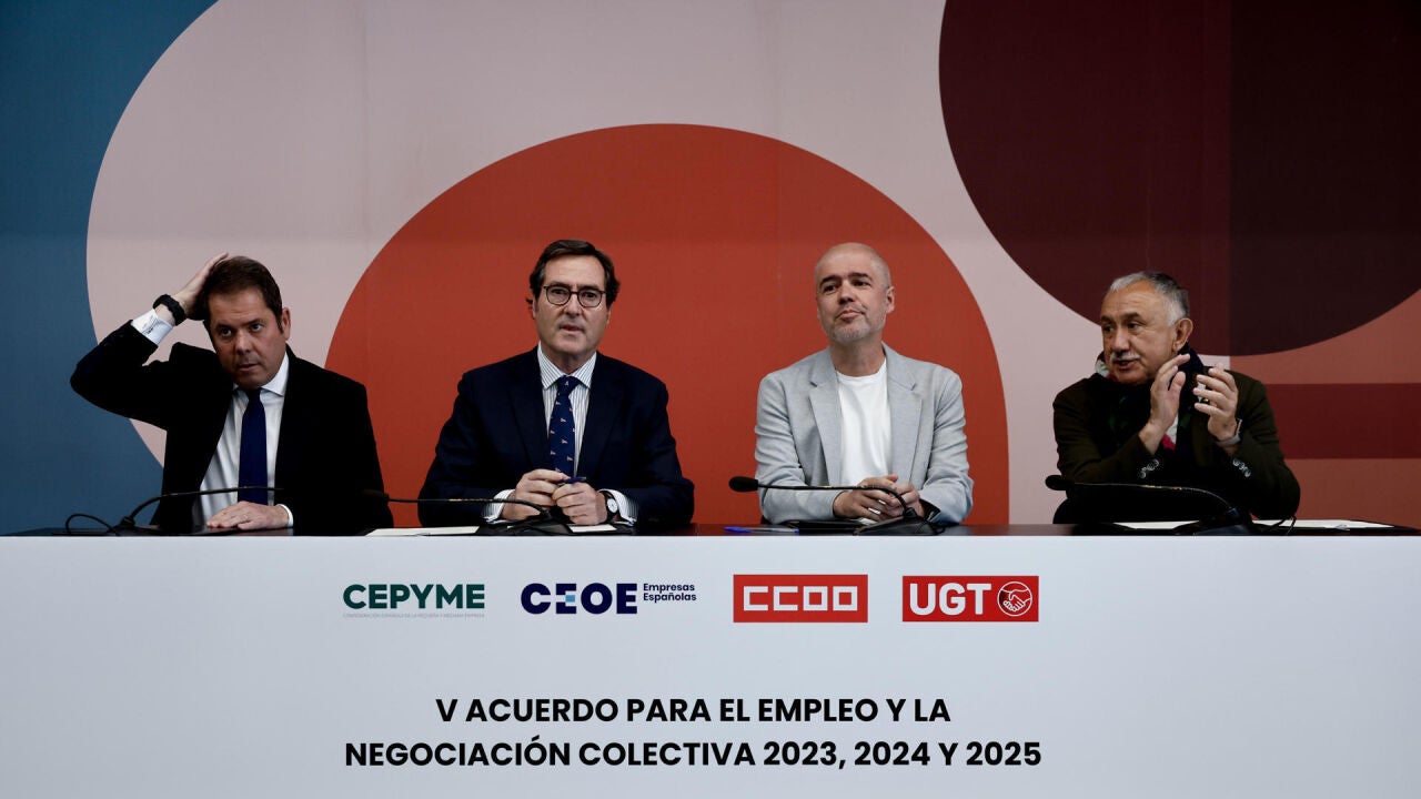Los sindicatos CCOO y UGT y la patronal CEOE-Cepyme han firmado el nuevo acuerdo para el empleo y la negociación colectiva (AENC), que establece una subida de salarios del 4 % en 2023 y del 3 % en 2024 y 2025, así como una cláusula de revisión del 1% en función de la inflación.