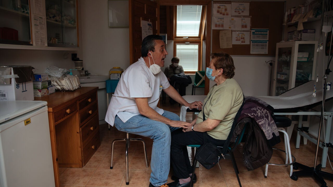 Tiene su propio consultorio, pero también se desplaza a las casas de los pacientes en bicicleta en la que le cabe el maletín, todo el pueblo le conoce por Don Ángel y él conoce los nombres de todos los vecinos.
