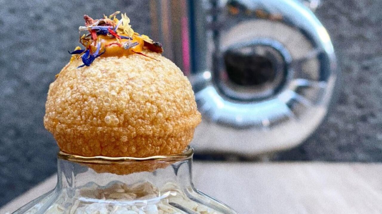 La tapa 'risotada' consiste en un Pani Puri relleno de arroz con leche (cremoso-risotto) de coco, con crema de naranja y crema de arroz con leche tostada. Además de sus riquísimos ingredientes, lo mejor de esta receta es su forma de comerla.