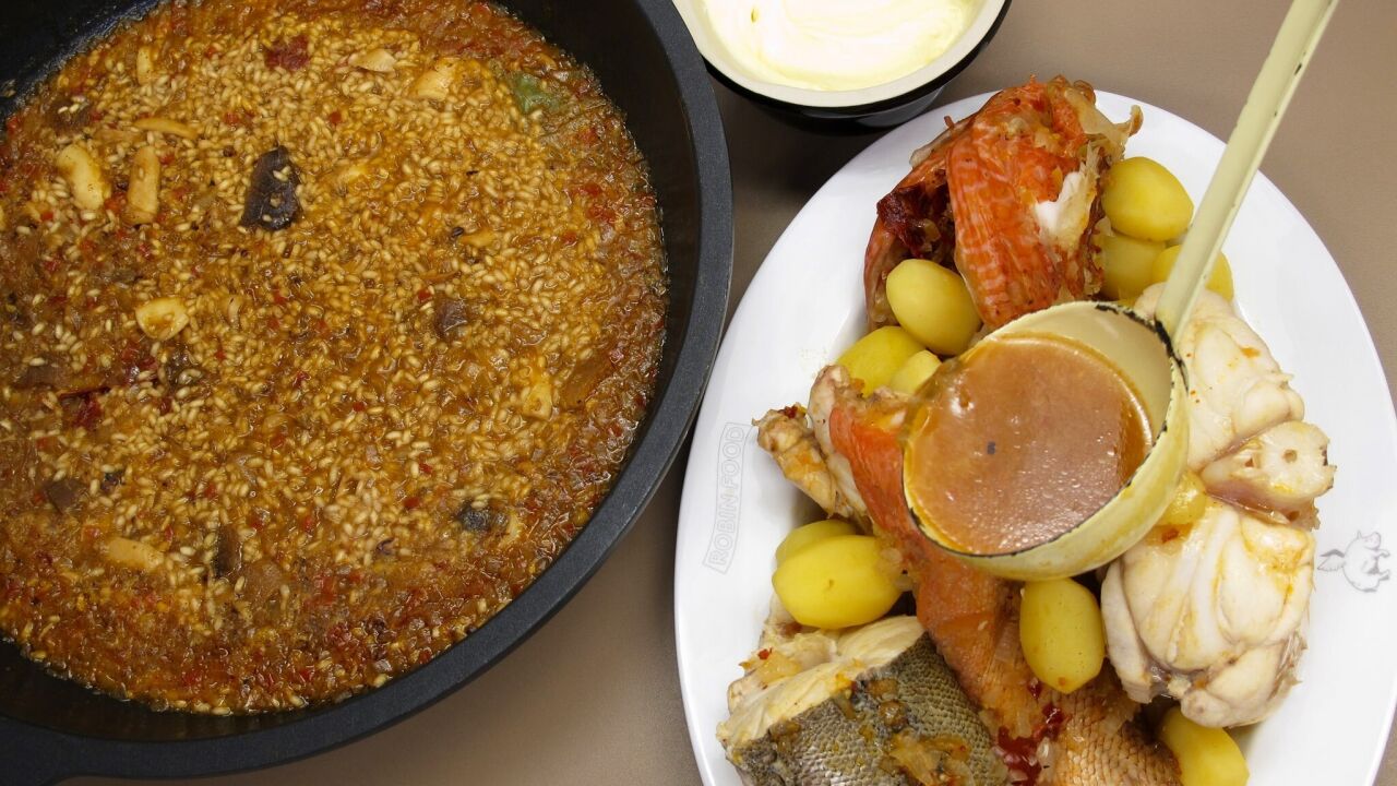 Comer primero el pescado escurrido y las patatas regadas con aceite crudo o alioli y de postre, el arroz.