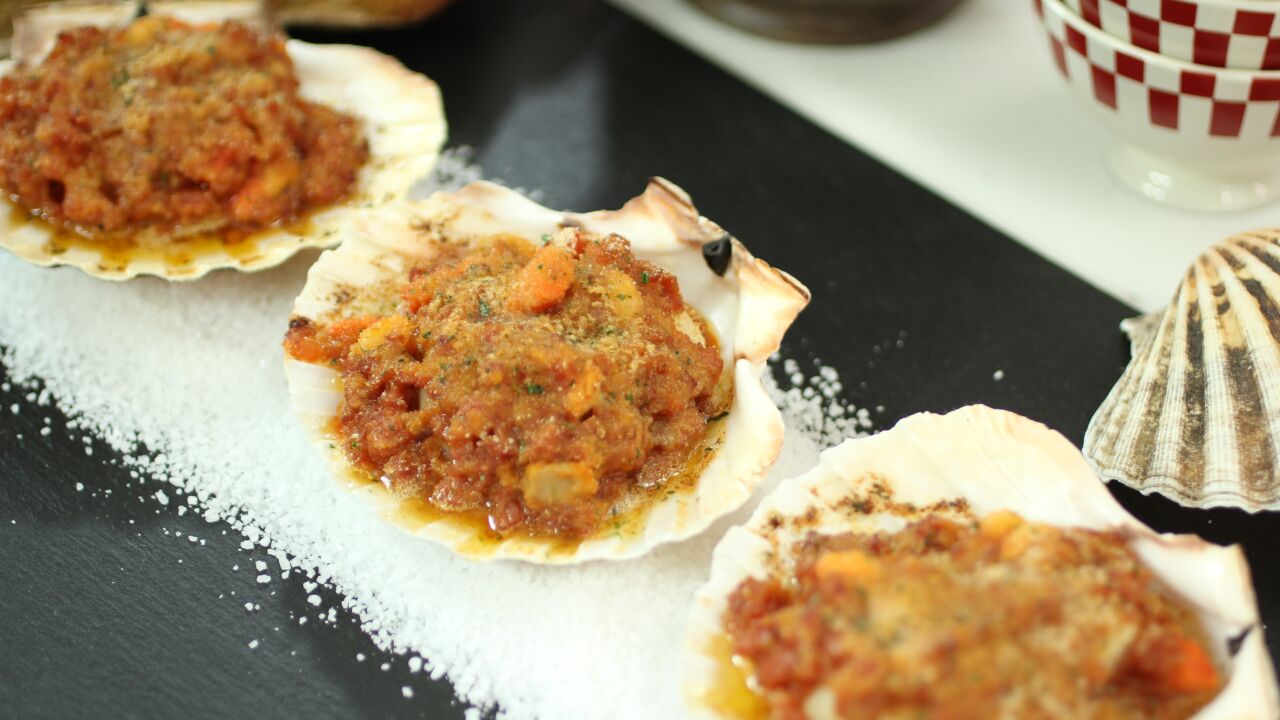 Separar los corales de las vieiras, picarlos, y reservar las conchas cóncavas.