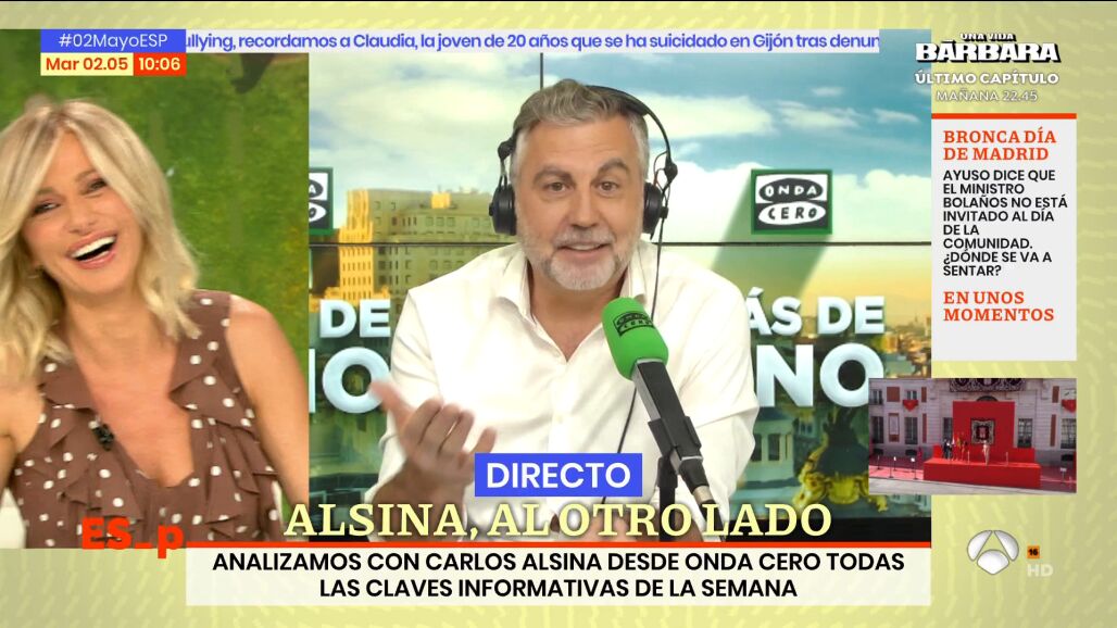 Carlos Alsina se pronuncia durante su intervención en 'Espejo Público' sobre el desencuentro que han mantenido la presidenta popular Isabel Díaz Ayuso y el ministro de Presidencia, Félix Bolaños, a cuenta de la asistencia del socialista a los actos conmemorativos de este 2 de mayo en la Comunidad de Madrid.